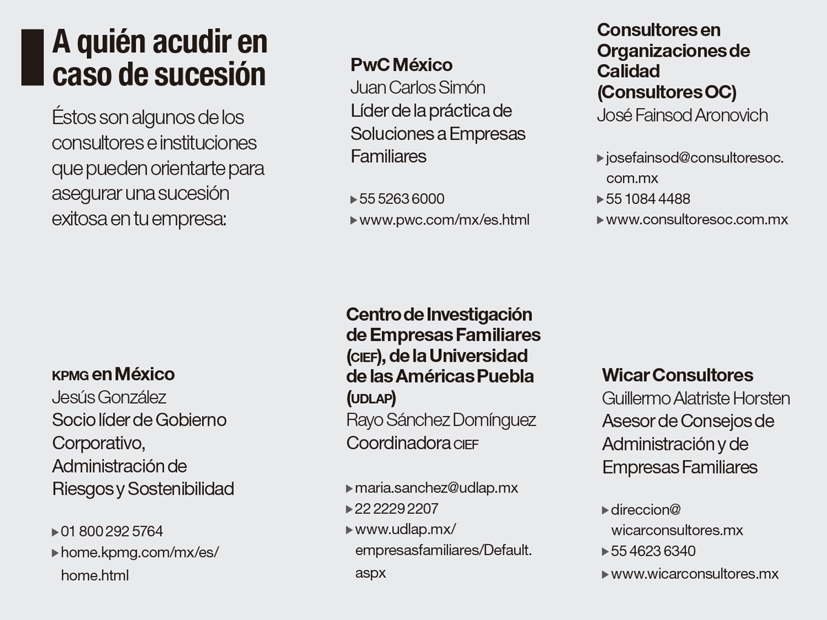 Juan Carlos Simón, de PwC México, advierte: “Si el heredero no tiene estudios ni es bueno para los negocios, y lo único que tiene es el apellido, no podemos permitir que de nini pase a director general”. Hace unos 15 años, Beneficia se acercó a un despacho para implementar su código y consejo familiar. Pero con una tendencia de crecimiento promedio anual del 25 por ciento, ahora desean tener garantizada su continuidad, para sus clientes, colaboradores y accionistas.