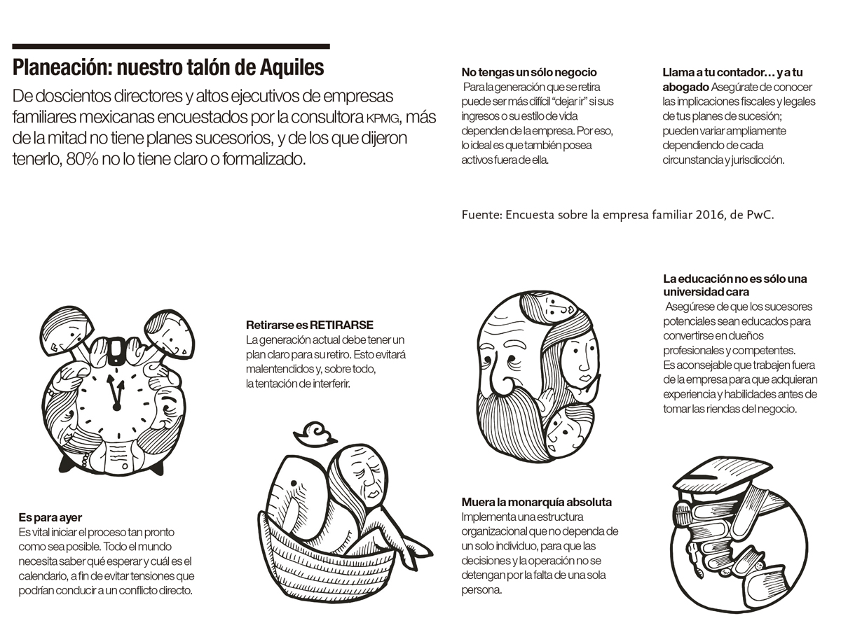 Para él, la razón de tal fracaso es simplísima: los empresarios toman las decisiones de la sucesión con la víscera y no con la cabeza. Es tristemente común que los dueños de las corporaciones den más peso a cuestiones sentimentales que a las capacidades directivas de sus herederos. Otra causa del fracaso es que a veces ocurren imprevistos que dejan incapacitado al líder de la empresa y no había nadie preparado para sustituirlo.