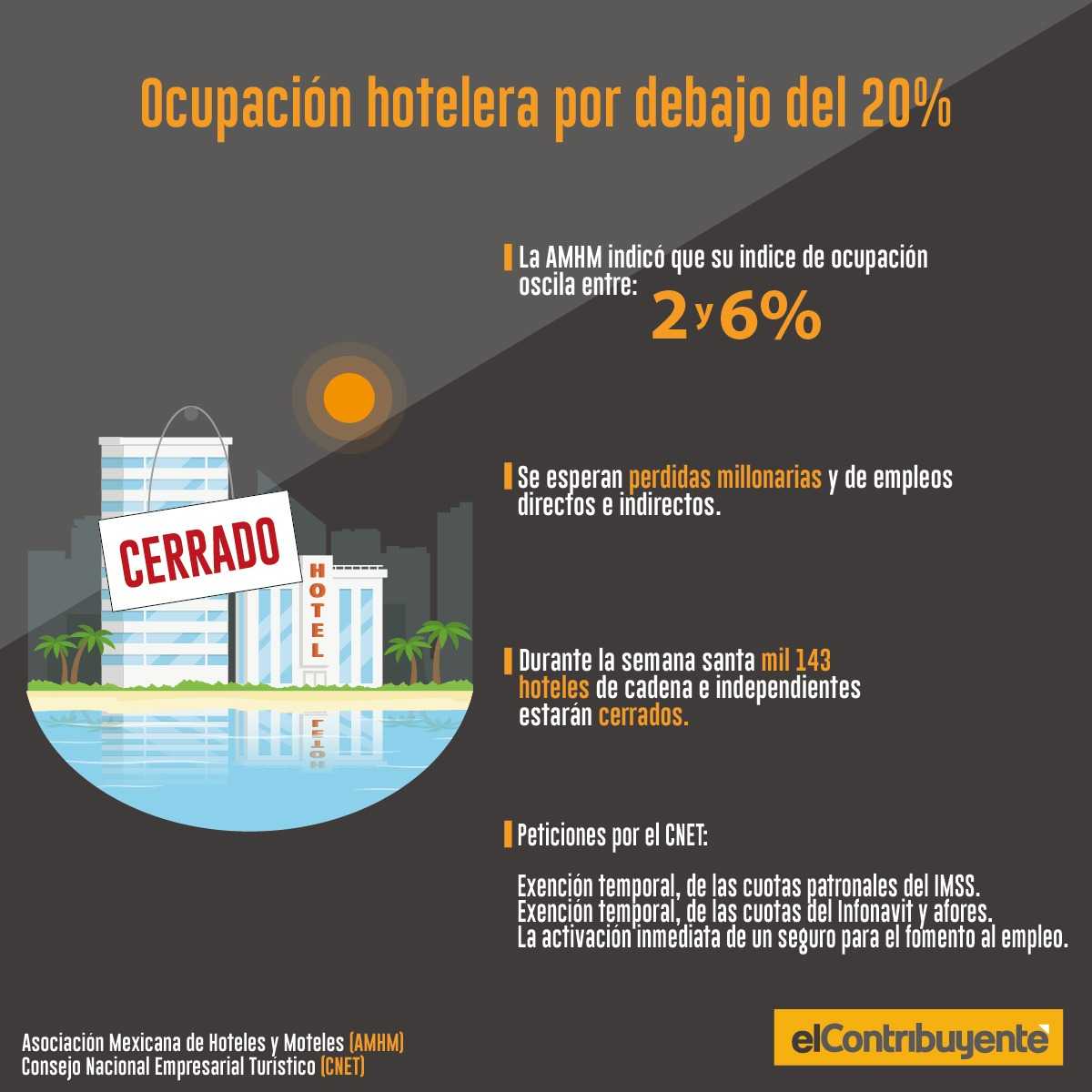 De acuerdo al CNET, durante el periodo vacacional de Semana Santa, cuando el sector hotelero normalmente tiene una actividad intensa, mil 143 hoteles permanecerán cerrados, lo que pondría en peligro más de 100 mil empleos. Por ello, los hoteleros pidieron a Alfonso Romo, jefe de la Oficina de la Presidencia, que intercediera por ellos para perdonarles durante al menos tres meses el pago de cuotas patronales.