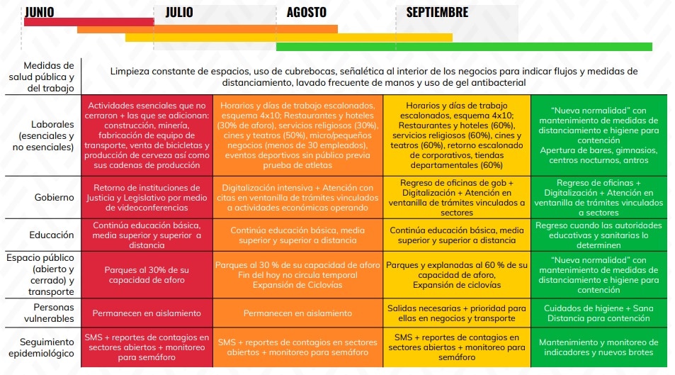 La nueva normalidad será escalonada y será bajo el sistema de semáforo para el regreso de las diferentes actividades. Se prevé que el semáforo rojo permanezca hasta el 15 de junio.