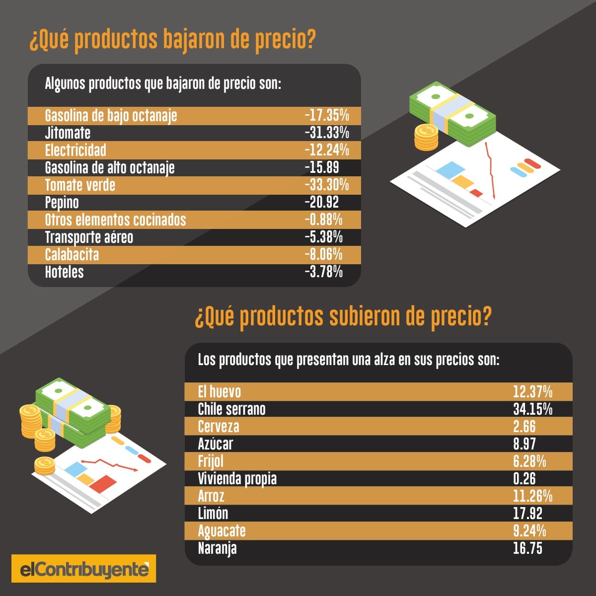 Algunos productos bajaron de precio son gasolina de bajo octanaje, con -17.35%; el jitomate, con -31.33%; electricidad, con -12.24%; la gasolina de alto octanaje, con -15.89%; tomate verde, con -33.30%; Pepino, con -20.92%; otros elementos cocinados, con -0.88%; transporte aéreo, con -5.38%; calabacita, con -8.06% y los hoteles, con -3.78%