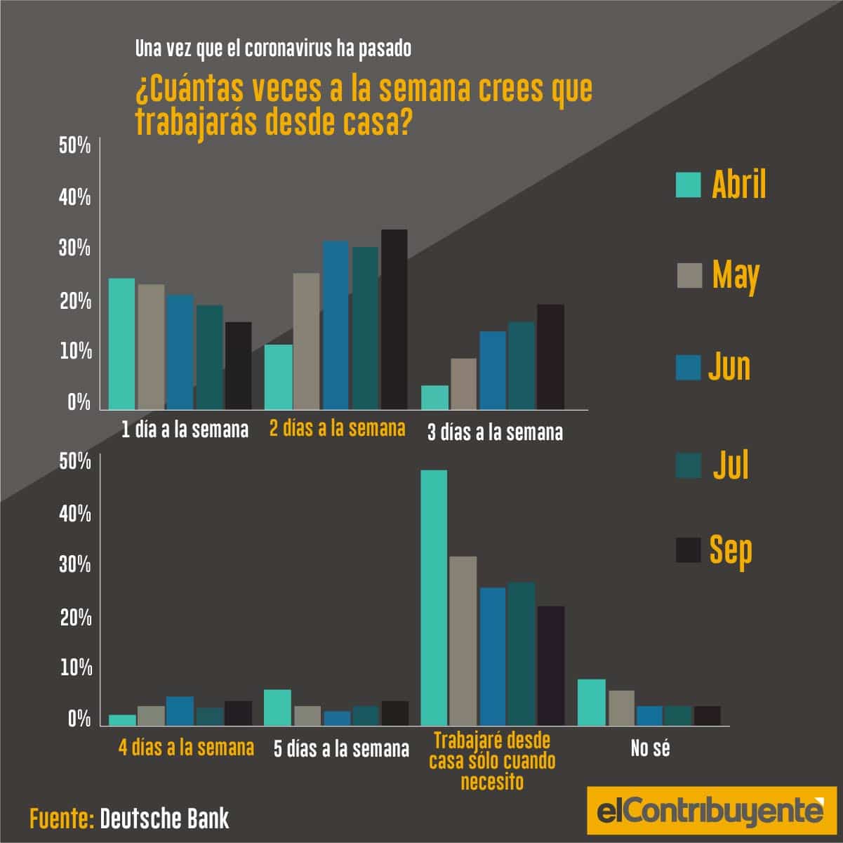 Los resultados de la investigación de Templeman revelaron que más de la mitad de los que trabajan de forma remota quieren seguir haciéndolo entre dos y tres días a la semana, incluso después de que termine pandemia. La recopilación de datos se realizó en septiembre 2020 a alrededor de 800 personas.
