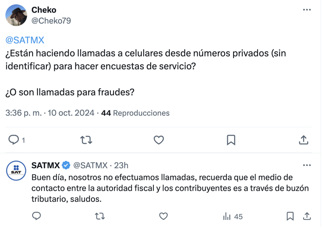 En este contexto, un contribuyente recientemente le preguntó al SAT, a través de una red social que si estaban realizando llamadas telefónicas para hacer encuestas de servicio.