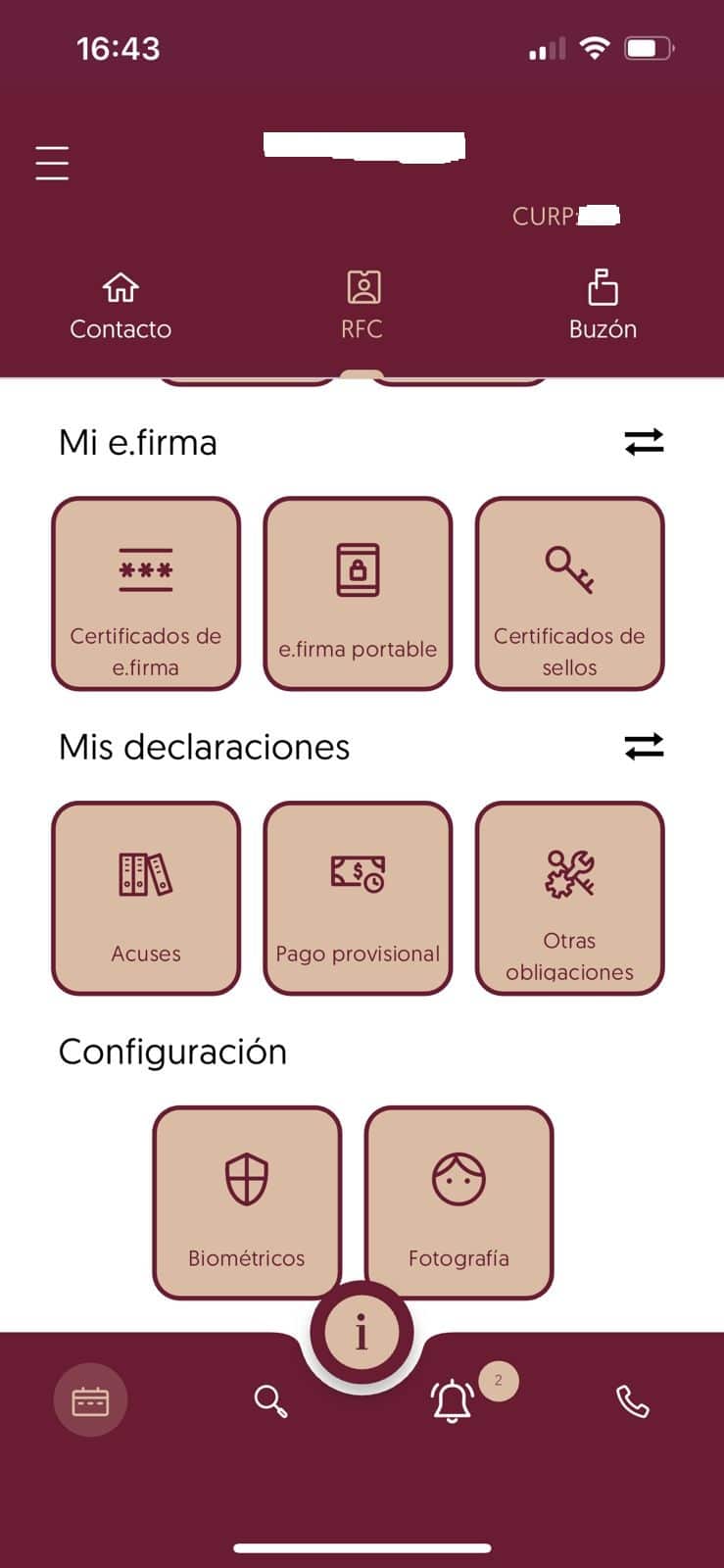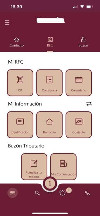 Una vez dentro de la aplicación, se despliega un menú con varias funciones. En particular, hay dos secciones muy útiles para cuando estás fuera de tu oficina y necesitas tu información fiscal: